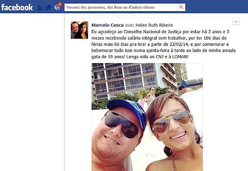 O homem usou o Facebook para postar fotos onde aparece com a namorada na praia. "Eu agradeço ao Conselho Nacional de Justiça por estar há 2 anos e 3 meses recebendo salário integral sem trabalhar, por ter 106 dias de férias mais 60 dias pra tirar a partir de 23/03/14, e por comemorar e bebemorar tudo isso numa quinta-feira à tarde ao lado de minha amada gata de 19 anos! Longa vida ao CNJ e à Loman [Lei Orgânica da Magistratura Nacional]!", escreveu na legenda de uma delas.